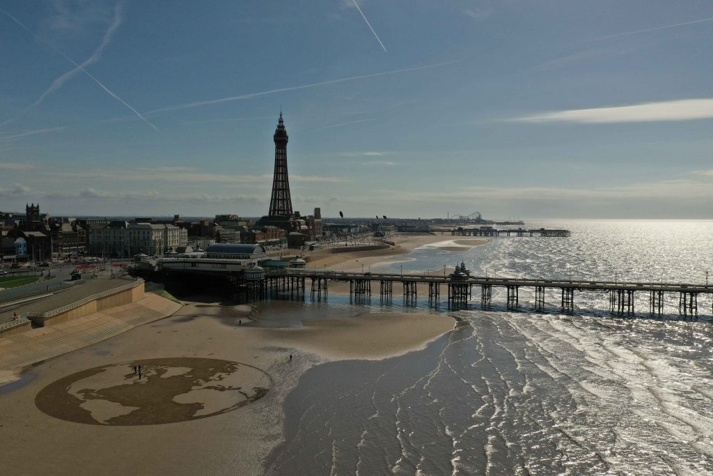 You can’t have a day at the seaside without fish and chips and happily the location of the sand drawing was right by north pier, under the watch of Blackpool tower and only a short walk to Harry Ramsden’s. We love working in Blackpool and this time got to stay in a castle! The bingo was in full swing when we arrived but we had an early start to make the sand art so had to give it a miss, sadly.